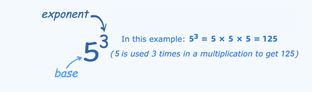 5³is read as “five to the power of three” or “five cubed”.5 × 5 × 5 = 5³. - Power: The result of the multiplication is called the power.
